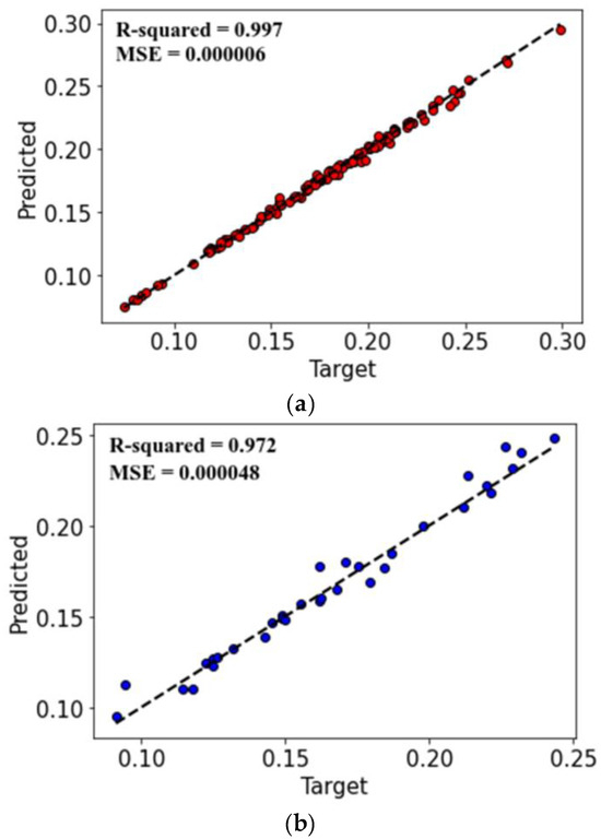 It is essential to distinguish between training and test errors while evaluating a model. Training errors are calculated using the same dataset to train the model, but a distinct, unseen dataset is used to calculate the test error. The R2 value of the training dataset quantifies the variation the model captures within the trained samples. On the other hand, the R2 value of the testing dataset acts as a measure of the model’s capacity to make predictions. However, the model was run after dividing the data (162 samples) into the training set and test set by allocating 80% of the actual data (129 samples) for training and storing 20% for testing, resulting in 33 samples. The reliability of the experimental data was verified by artificial neural network analysis. This analysis was presented in the previous article [46].