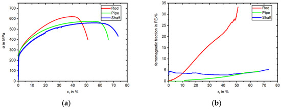 The results of the tensile tests are presented in Table 4 for comparison of the three batches. The resulting stress–strain curve is illustrated in Figure 7a with the corresponding evolution of the measured ferromagnetic fraction in Figure 7b.