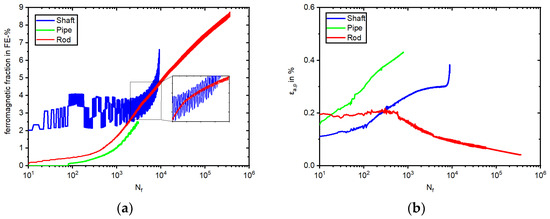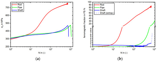 The change in the magnetic FeritscopeTM signal is illustrated in Figure 10a. Starting at 0.0 FE-% and ending with 8.7 FE-%, the Rod specimen showed the highest increase, starting rapidly at 1000 cycles. The specimen taken from the Shaft started with 2.0 FE-% due to the presence of δ-ferrite and showed, besides measurement changes in the FeritscopeTM signal due to the Villari effect, an increase to 6.6 FE-% at failure. In contrast, the Pipe material showed a similar signal development to the Rod specimen with no initial measured ferromagnetic fraction and failed at 2.5 FE-%.