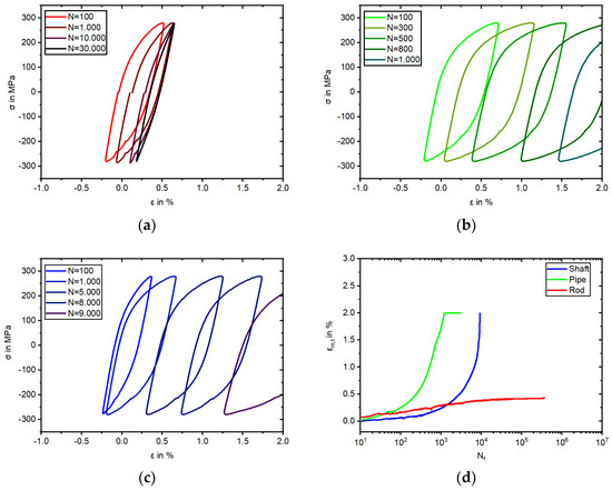 The results of the stress-controlled fatigue tests are illustrated in Figure 9 and Figure 10. The experiments were conducted with a stress amplitude of 280 MPa at a stress ratio of Rσ = −1. In contrast to the total strain-controlled experiments, an increased frequency of 2 Hz was chosen for the stress-controlled experiments to obtain a high number of load cycles within a reasonable time and temperature increase. All three batches showed cyclic ratcheting in the stress-controlled fatigue test, and thus, an increase in the total mean strain (εm,t) (Figure 9d), and with this, the movement of the hysteresis loops to the higher positive strains (Figure 9). For Shaft and Pipe, this behavior was more pronounced than for Rod, ultimately exceeding the measuring range of the extensometer for the Pipe at 1209 cycles and Shaft at 9150 cycles (cf. Figure 9b,c). For the Rod, the cyclic ratcheting reached a saturation at around 10500 cycles within the measuring range of the extensometer, and the εm,t did not increase significantly from this point.