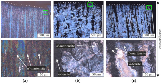 After common metallurgic preparation of the micrographs, material was removed from the surface using electrolytic polishing to avoid DIM due to mechanical polishing. If necessary, the polishing process was conducted at an increased temperature (90 °C) to avoid the occurrence in DIM in the initial state due to abrasion. Furthermore, etching by the Beraha-II agent was used to distinguish the individual grains, their orientation, the austenite and α’-martensite, as well as chemical inhomogeneities [10] in the micrographs. For more details of the process, see [35]. Additionally, electron backscatter diffraction (EBSD) images of the grain orientation were generated using a scanning electron microscope (SEM) of the type QUANTA 600 FEG, manufactured by FEI. There, an accelerating voltage of 20 kV at a step size of 1 with a view field of 300 µm was applied. For analyses of the specimen microstructure after failure, investigations were undertaken using Beraha-II etching in the initial state and after the tests. The resulting color of the etched micrographs varied due to variations in the preparation process.