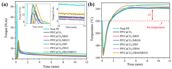 (a) Torque of neat PP and PP/CaCO3 composites with flame retardants in the function of time and (b) Temperature profile of processing of neat PP and PP/CaCO3 composites with flame retardants in the function of time.