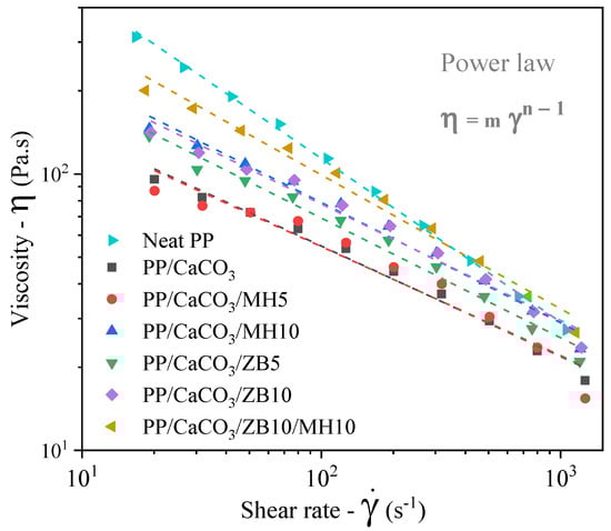 When adding MH and ZB inorganic flame-retardant additives, a low but proportional increase in viscosity values was observed, with a more significant increase for ZB. For instance, PP/CaCO3/MH5 behaved similarly to PP/CaCO3, while PP/CaCO3/ZB5 exhibited significantly higher viscosity than PP/CaCO3. For most other compositions, the behaviour was similar; however, for the PP/CaCO3/ZB10/MH10 composite, the viscosity values approached those of the neat PP. These increments in viscosity for compositions with higher flame retardant contents could be related to the shape of the additive particles, their interaction with the polymer chains, and the composite morphology. Smaller additive particles than CaCO3 have more surface interaction with polymer chains, restricting chain mobility and increasing flow resistance. Additionally, their smaller size allows them to distribute in the matrix regions between large CaCO3 particles.