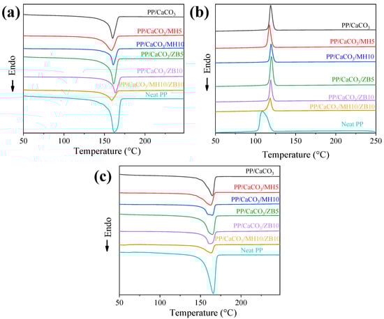 DSC curves of neat PP and PP/CaCO3 composites with zinc borate and magnesium hydroxide: (a) First heating curves, (b) second heating curves, and (c) cooling curves.