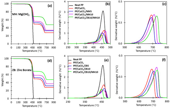 TGA curves of (a) neat PP and PP/CaCO3/MH composites (5 and 10 wt.% of MH); (b) DTG of neat PP and PP/CaCO3/MH composites; (c) DTG of PP/CaCO3 and MH showing the stability of calcium carbonate; (d) neat PP and PP/CaCO3/ZB (5 and 10 wt.% of ZB); (e) DTG of neat PP and PP/CaCO3/ZB composites; and (f) DTG of PP/CaCO3 and ZB showing the stability of calcium carbonate.
