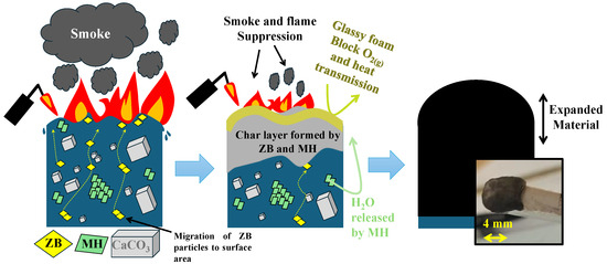 Proposed flame retardancy mechanisms for the system PP/CaCO3/ZB10/MH10 composites. The synergistic effect of zinc borate and magnesium hydroxide is demonstrated in this mechanism by blocking heat transmission and flame and smoke suppression.