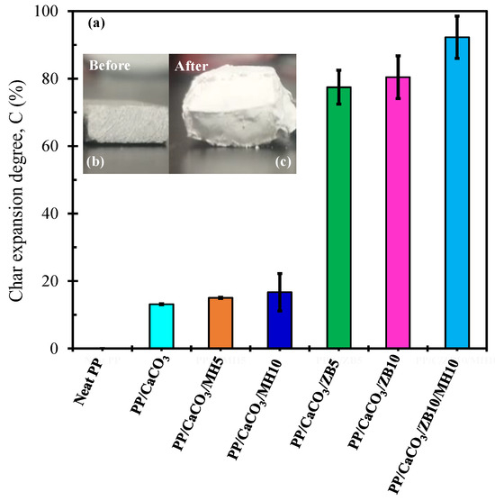 The effect of inorganic flame retardants on the char expansion of PP/CaCO3 composites reinforced with additives was evaluated by pyrolysis test and the data is shown in Figure 7. The results demonstrated that the addition of zinc borate in the polypropylene/CaCO3 composites increased the char expansion. Additionally, it created a foamy structure on the char. This behaviour was also reported by Gillani et al. [32]. It was noted that a high content of ZB also increased the char expansion degree, and PP/CaCO3/ZB10/MH10 demonstrates the highest enhancement in char expansion. The char layer’s efficacy is greatly associated with its physical characteristics including foam structure and expansion [32,45].
