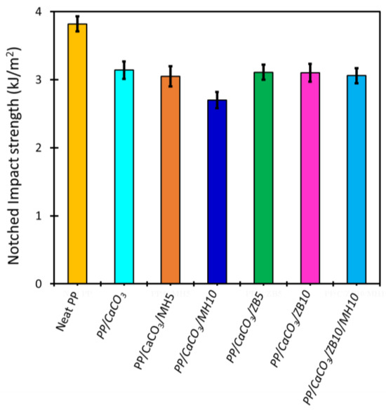 Similarly, the impact strength behaviour correlated negatively with the tensile test results. The addition of stiff ceramic particles in the polymer matrix led to a significant decrease in impact strength (Figure 8), particularly if the particle–matrix interface is weak. However, this decrease in impact was less pronounced than that observed for UTS and at strain at break, and most composites displayed impact strength values around 3 kJ/m2. Interestingly, the addition of 10 wt.% MH resulted in a further reduction in impact strength, potentially due to the morphological development of flatter-shaped particles in large aggregates, as seen in SEM images (Figure 3e). However, this reduction was not observed in the PP/CaCO3/ZB10/MH10 composite. Overall, the general reduction in impact strength does not significantly impact the material’s potential, especially for applications utilizing compositions similar to PP/CaCO3. Finally, it is important to note that the impact strength values around 3 kJ/m2 found in this work are in agreement with Izod impact strength (ISO) of 2.50–15.9 kJ/m2 for polypropylene/calcium carbonate (50 wt.%) materials found in the MatWeb database [46].