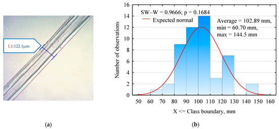(a) Photo of a hemp fiber taken with a microscope camera; (b) histogram of the thickness of the hemp fibers used in the study.