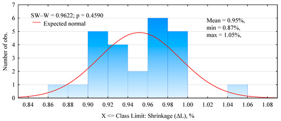 The test results for changes in length after drying are shown in Figure 4. (The initial moisture content of the fibers was about 168%, after drying, about 1%). The shrinkage value tested ranges from 0.87% to 1.05%, with an average value of 0.94%. Knowing the characteristics presented allows the length differences within the composite to be determined. For the longest fibers used in the mechanical characterization tests (approx. 100 mm), the length difference due to moisture changes is approximately 1 mm (1%). The shorter the fibers, the smaller this difference is even more. Because the length shrinkage of hemp fibers is so insignificant, with short fibers of about 5 mm, such shrinkage may not significantly affect the mechanical properties of the gypsum–fiber composites produced. With long fibers, however, such changes may already have a significant effect. This is because building gypsums are characterized by a lack of contraction [21], which, in the case of fiber shrinkage, can cause voids in the structure of the composite and thus weaken it in terms of mechanical properties.