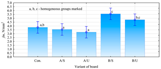 Hemp fiber is characterized by high absorbability. The course of water absorption is very dynamic for the first 15 min, during which the moisture content of the fiber increases by more than 160%. After 30 min, the hemp fibers have more than doubled in weight compared to their dehydrated state. A further increase in absorbability, although already much smaller, is noticeable up to the first hour of the test, reaching a maximum value of 215%. For the next four hours, the fiber takes up no more water. The high and rapid absorption of hemp fibers, especially during the first stage of their contact with water, is a problematic factor, as this is when the gypsum bond formation and curing occurs. Regardless of the modifier used, hemp fibers only take up water during the first hour of the soak test. Fibers modified with Unicell primer increase in mass by 132% in the first 15 min. Thus, the agent reduced the absorbability of fibers modified with it, relative to raw fibers, by 31%. After 30 min, the Unicell-modified fibers had increased in mass by 167% relative to the dry fiber. Further measurements showed that the increase in absorbability of the hemp fibers reached 168%, after which it did not change significantly until the end of the test. The difference in absorbability between the maximum values was 46.5%. Hemp fibers treated with surface modification with pMDI adhesive and Soudal primer have significantly lower absorbability. When the fibers were impregnated with pMDI glue, the fiber mass increased by 50% for the first 15 min, after which the water uptake dynamics started to decrease. After 30 min, the fibers increased their mass by 80%. At further stages of the test, the fibers increased their mass to approximately 87% and, with slight variations (+0.2%), maintained this absorbability level until the test’s end. Fibers impregnated in pMDI are stiff and difficult to spread in the gypsum slurry after cross-linking the adhesive. Despite attempts, producing a composite with such impregnated fibers was impossible. Fibers impregnated with Soudal primer show the best quality characteristics. During the first fifteen minutes of soaking, the weight of the fibers increased from the dry state by only 27.5%. The difference in absorbability between the impregnated and raw fibers at this test stage (15 min) is almost 136%. After 30 min, the fibers had increased their mass by 46%, and after 60 min, they had reached their maximum absorbability of only 60%. The first 30 min of soaking is the most significant in the context of fiber–gypsum board manufacture, as during this time, most of the water evaporates from the slurry, and the fibers do not take up significant amounts of the make-up water, which can affect several properties of the final product. The saturated fiber during the board setting process can also affect the bonded gypsum matrix. The positive effect of the modification used was confirmed by tests to evaluate the mechanical properties (Figure 6). The panels produced by mixing the primers with the dry gypsum mass and introducing hemp fibers into the so-formed dense matrix, irrespective of the type of primer used, show a lower flexural strength (Figure 4). The boards manufactured with Soudal-impregnated fibers have a 9.8% lower strength than the reference variant. In contrast, the decrease is even more significant in the case of boards made with Unicell-impregnated fibers, for which the flexural strength decreases by almost 20%. Much better results were obtained by preparing the boards according to variant B. In this case, the boards produced with Soudal primer-impregnated fibers show an increase in strength of up to 40%, while those impregnated with Unicell show an increase of almost 21%. The differences between these variants are not statistically significant.