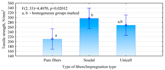 To assess the influence of the impregnated fibers’ quality on the hemp-fiber boards’ strength, tests were carried out on the axial tensile strength of the fibers (Figure 8). The tests show that some increase in fiber strength is observed after impregnation. This increase is similar to the rise in the strength of the boards. However, the scatter in the results is very large. For this reason, there are no statistically significant differences between pure and Unicell-impregnated fibers and between Unicell-impregnated and Soudal-impregnated fibers. The increase in board quality can be attributed to an improvement in the load-bearing capacity of the fibers themselves. Still, we currently have too little information to assume that this is the only reason for the increase in the mechanical properties of the boards. However, our results for pure fibers are significantly lower than those reported in the literature [38].