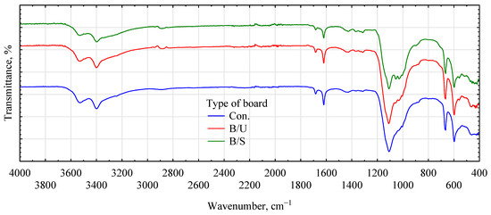 FTIR spectra of samples of the respective gypsum–fiber boards were performed to confirm whether the selected primers actually fulfill the chemical or mechanical role attributed to them. The interpretation was based on the bands at 1000 and 1100/1150 cm−1, which are bands characteristic of gypsum (gypsum absorption band). In Figure 9, it is characterized by its high intensity and specific shape. In the case of the spectra of samples made of building gypsum and hemp fibers, two smaller bands emerge at the slope of this band, especially when Soudal priming emulsion is used. Peaks at 1300 cm−1 also appear weaker than expected but more pronounced than in the control board and in the Unicell-modified fiber boards at 2930 cm−1, associated with styrene–acrylic copolymer derivatives.