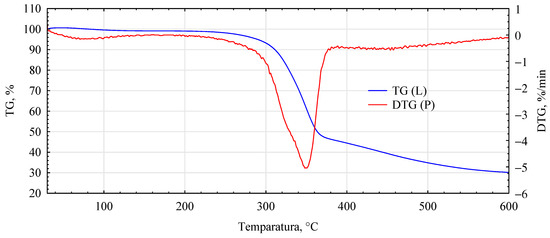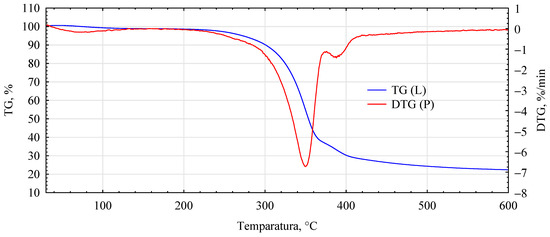 FTIR spectra of the analyzed variants were recorded using a Nicolet iS5 Fourier transform spectrophotometer(LPP Equipment AG, Uster, Switzerland) in the 4000–400 cm−1 range with a resolution of 4 cm−1. The thermogravimetric analysis (TGA) was carried out using a Netzsch STA 449 F5 Jupiter (Netzsch, Selb, Germany). The analysis was carried out with the following parameters: sample mass 20 ± 1 mg, atmosphere He, flow rate 15 mL/min, heating rate 5 °C/min, fixed final temperature 600 °C.
