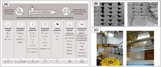 (A) A scheme presenting the influence of PLA processing and degradation phenomenon on different properties like molecular weight, viscosity, thermal/mechanical properties, etc. [50]. (B) The differences in the filament layer structure of 3D printed parts due to changing viscosity factor [51]. (C) Flow instabilities during the foil blown extrusion process, for PLA/PBAT blends [49]. Copyright 2024 MDPI.