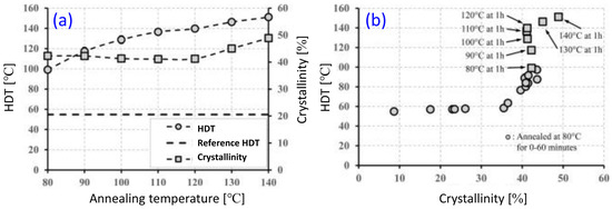 (a) Heat deflection temperature (HDT) of PLA annealed at various temperatures for one hour. The dashed horizontal line represents the HDT of the reference (unannealed) PLA. (b) HDT of PLA annealed at 80 °C as a function of crystallinity, annealed for various amount of time, and at various temperatures from 80 °C to 140 °C for 1 h. Figure reproduced with permission from Ref. [63]. Copyright 2016 Elsevier.