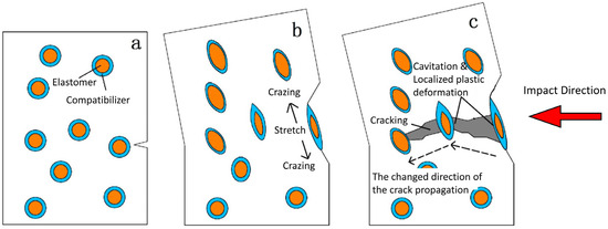 Cavitation of the elastomer particles under stress, leading to a reduction in hydrostatic stress at the top of the microcrack and enabling local plastic deformation to absorb the impact energy (Figure 6c).