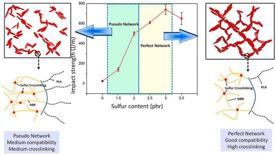 Dynamic vulcanization, which involves selective crosslinking of a rubbery polymer during melt blending with a thermoplastic, has proven to be a highly efficient method for toughening brittle plastics. Many super-tough PLA blends have been prepared using this technique [167,168,169,170,171]. Super-tough PLA/acrylonitrile butadiene rubber (NBR) blends were created using a dynamic vulcanization process [172]. The sulfur content was crucial in transforming the blend morphology and impacting the final impact strength. Figure 7 shows that the optimal sulfur content significantly enhances impact strength by forming a strong rubber network and improving interfacial adhesion.