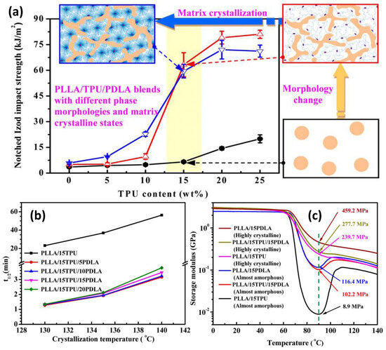 (a) The remarkable improvement in impact toughness of PLLA/TPU blends with the addition of PDLA though morphology and phase changes. (b) Half-crystallization time (t½) as a function of crystallization temperature for PLLA/TPU (85/15) blends with various contents of PDLA. (c) The storage modulus indicating the heat resistance of injection-molded PLLA/15TPU and PLLA/15TPU/15PDLA blends with different PLLA matrix crystalline states. Adapted with permission from Ref. [196]. Copyright 2015 ACS.