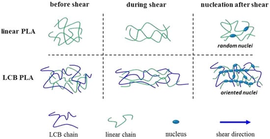 - Fang, H.; Zhang, Y.; Bai, J.; Wang, Z. Shear-induced nucleation and morphological evolution for bimodal long chain branched polylactide. Macromolecules 2013, 46, 6555–6565. [Google Scholar] [CrossRef]