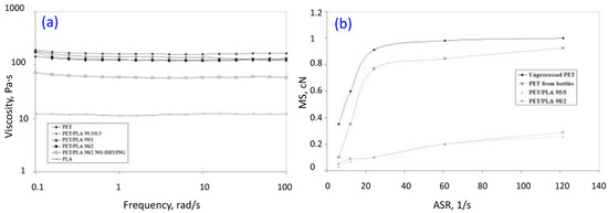 The issue of processability may relate to several aspects including the ease of processing, but the principle of optimal choice depends primarily on the method of processing [38,39]. In the category of engineering plastics, the most important production technology is injection molding and its variants such as gas-assisted injection molding technology or physical/chemical foaming injection molding [40,41,42]. In most cases, the low viscosity of the PLA polymer melt is required in this field. Because of that, PLA-based blends have quite favorable flow characteristics, which result primarily from the low viscosity of PLA and its relatively low melting point, at around 160 °C. Both features are useful, especially when compared to the processing of amorphous thermoplastics such as PC, PMMA, or ABS. The required melt processing temperatures for these polymers reach 250 °C or even 300 °C, and the main reason for that is their high viscosity at lower temperatures. The addition of PLA results in a reduction in the viscosity of the mixture, which results in the required flow path of the material in the mold and translates into cost reduction and improved mold cavity reproduction. For the other popular processing techniques such as extrusion of profiles or foils, a reduction in the viscosity or the polymer melting point could be also beneficial, but in this case the viscoelastic properties of the polymer, like melt strength, are equally important and usually deteriorate with decreasing viscosity.