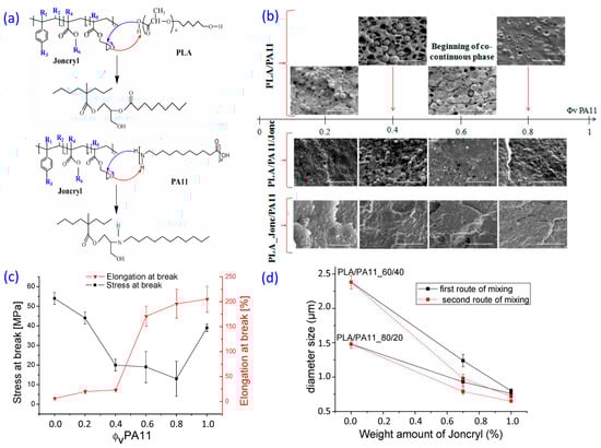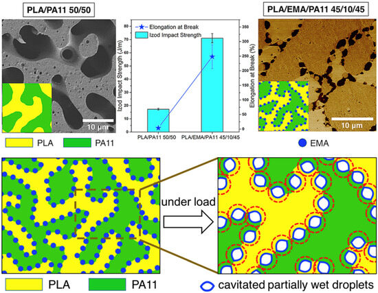 - Zolali, A.M.; Heshmati, V.; Favis, B.D. Ultratough co-continuous PLA/PA11 by interfacially percolated poly(ether-b-amide). Macromolecules 2017, 50, 264–274. [Google Scholar] [CrossRef]
