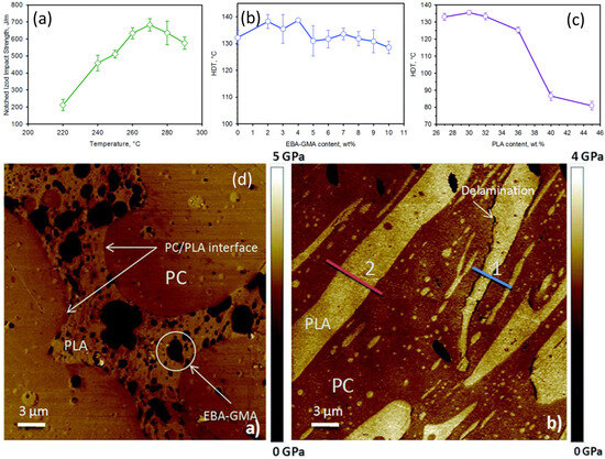 The increase in the temperature resistance is the most noticeable effect of annealing. However, the reconstruction of the phase structure carries all the related consequences, which fortunately in the case of PLA and its blends is most often positive [187]. The improvement in heat deflection temperatures (HDT) of annealed PLA-based blends and their composites has been widely reported and the detailed annealing conditions and the highest HDT achieved are presented in Table 1.