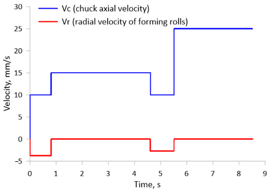 A diagram of skew rolling in a CNC rolling mill is shown in Figure 3. Skew rolling of bimetallic rods is carried out with three tools arranged symmetrically around the rolling axis every 120°. Each tool has an adjustable skew angle, relative to the rolling axis (ϴ), of −10° to +10°. In the tests of rolling the bimetallic material, the tool skew angle ϴ was assumed to be 5°. The tools are tapered cylinders, where a cylindrical surface with a diameter of Dr = 150 mm is used to calibrate the shaped part. The forming part, on the other hand, is a tapered surface with an angle of inclination α (α = 20° was assumed in the tests). The tools perform rotary motion in the same direction at a constant rotational speed of no = 60 rpm with simultaneous numerically controlled movement of the rolling material in the direction of the rolling axis at a velocity of Vr. The correct choice of tool radial velocity (Vr) and chuck axial velocity with material (Vc) results in the desired dimensions of the bimetallic forging. In the tests, the tools performed radial movement towards the axis of the bimetallic forging at a velocity of 2.7 mm/s and 3.75 mm/s (depending on the product step being formed). For the chuck, an axial velocity of 10, 15 or 25 mm/s was used, depending on the step being shaped. The exact time course of the individual velocities is shown in Figure 4.
