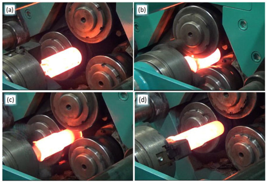 The different steps in the rolling process of the bimetallic material are shown in Figure 6. The heated billet is placed in the chuck and then moved into the workspace of the rolling mill (Figure 6a). Then, as a result of the execution of the control program entered into the controller, a sequence of tool and chuck movements is executed allowing the production of a bimetallic forging with the assumed geometric dimensions. During the radial movement of the rollers in the direction of the rolling axis, the tool penetrates the workpiece with a preset diameter reduction, this contributes to a change in the cross-section of the rolled forging. In contrast, the rotary movement of the rolling material is the result of tool contact with the rolling workpiece (Figure 6b). At the same time, the chuck moves at a preset velocity along the rolling axis, providing controlled axial rolling motion (Figure 6c). Once the bimetallic forging has exited the workspace, all movements of the CNC rolling mill are stopped in order to pull it out of the chuck (Figure 6d).