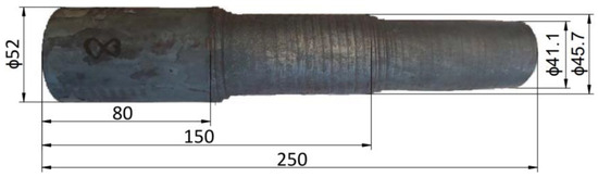 In all variants of the test, the billet length was 190 mm and the outer diameter was D = 52 mm. In contrast, the initial core diameter (d) varied in valence from the variant adopted. In variants I, II, V and VI it was ϕ 38 mm, in the other variants ϕ 34 mm. In contrast, the outer layer thickness (t) of the billet was 7 mm and 9 mm. The percentage of the outer layer made of C60 steel was 46.5% and 57.3%, respectively. Due to the risk of decarburization of the combined layers during heating of the billet material in the chamber furnace, the effect of pre-bonding of the front surfaces in the billet was analyzed in the last four variants, i.e., V–VIII, using the fusion welding technology. Table 2 shows the input factors for the rolling process of bimetallic materials. The shape and dimensions of the bimetallic material forging are shown in Figure 2b. Due to the specific features of the rolling process, it was assumed that the workpiece material would not be rolled in the chuck zone. However, under industrial conditions, it is possible to carry out rolling without any allowance for the chuck zone. The length of the chuck zone was assumed to be lg = 80 mm. The other lengths of the bimetal forging were assumed so that the necessary analysis of mechanical strength properties and macro- and microscopic observations could be made. The length measured from the beginning of the forging to the end of the first step was l1 = 150 mm, and the length of the entire forging was l2 = 250 mm.