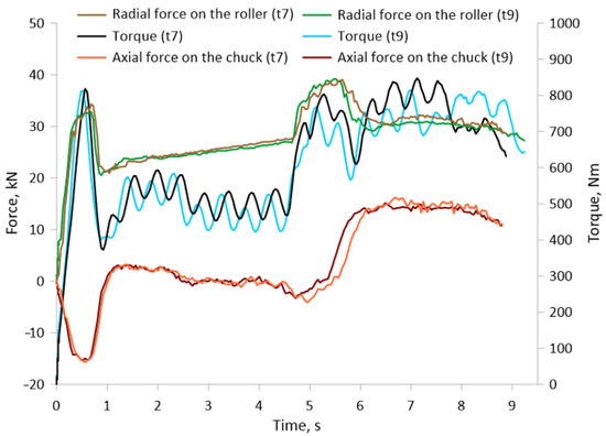 Characteristics of the force course during the rolling of a bimetallic billet with an outer layer thickness (tube) of t = 7 and t = 9.