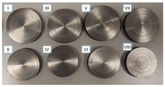 The bimetal forgings produced were cleaned and visually inspected. Sections were then taken and analyzed macroscopically to determine the quality of the weld (Figure 9). Analysis of the cross-sections showed that in all eight variants, no clear separation of the joined surfaces could be observed. This means that in all variants, there was a permanent welding of two different materials around the perimeter.