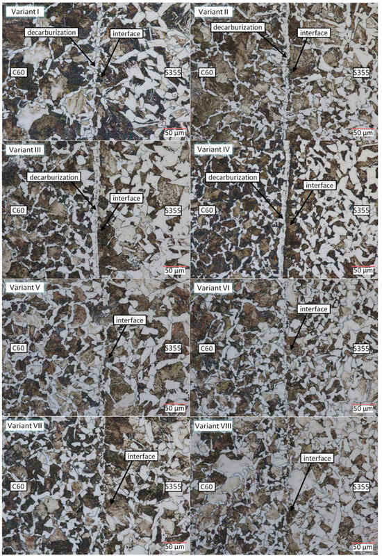 Figure 12 shows the microstructure taken from the bimetallic forging in the interface zone between the two materials (variants I to VIII) with the characteristic microstructure zones marked. In all variants, a heterogeneous pearlitic–ferritic structure is visible. In C60 steel, pearlite is present with separations of ferrite along the grain boundaries. The pearlite percentage is 82%. In S355 steel, the proportion of ferrite predominates and traces of Widmanstätten structures are visible. In the variants whose front surfaces were not protected by fusion welding (variants I–IV), a clear joint interface consisting mainly of ferrite grains is visible. This is caused by decarburization of the joined layers during heating in the chamber furnace due to contact with the furnace atmosphere. In the following variants (V–VIII), no visible joint interface is observed. A gentle mixing of the ferrite and pearlite grains has taken place. The microscopic analysis carried out confirms the negative effect on the microstructure of heating in the chamber furnace without adequate protection against oxidation and decarburization.