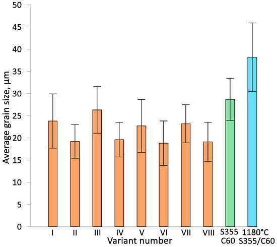 Measurements were taken of the average grain size in the weld zone of the two materials, the billet and the material taken from the chuck zone without metal forming and previously heated to a rolling temperature of 1180 °C. The results obtained are shown in Figure 13. In all variants of the bimetallic rolling process (I–VIII), the effect of metal forming on the grain size is noticeable in relation to the material taken from the chuck zone (without metal forming). This means that the grain size subjected to metal forming (rolling) is smaller than without forming. In all process variants, there is a significant value of the standard deviation of the mean grain size distribution indicating heterogeneity of the microstructure. The effect of diameter reduction values on grain size is noticeable. At larger diameter reductions, i.e., δ = 1.27 (variant II, IV, VI and VIII), the average grain size is smaller than in the other variants, where a smaller diameter reduction of δ = 1.14 was used, by about 5–6 μm and is about 18–19 μm. No effect of pre-welding on billet fronts (variants V–VIII) on the difference in grain size in the bimetallic forging with respect to rolling from billets without this type of protection (variant I–IV) is noted. A slight effect of the initial outer layer thickness t (t = 7 mm and t = 9 mm) on the average grain size is noticeable. The average grain size is slightly higher for the use of an initial wall thickness t = 9 mm. This can be explained by the fact that plastic strain decreases in the direction of the forming axis.