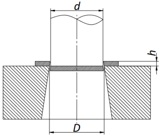 In order to determine the quality of the resulting weld, strength tests were carried out using the shear method according to the scheme shown in Figure 14. The thickness of the material to be sheared was taken as h (h = 10 mm). The diameter of the hole (D) was chosen to be 2 mm larger than the punch diameter (d).