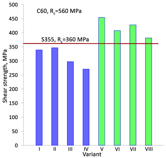 The obtained test results for the shear strength (Rc) of the resulting weld between the two materials in relation to the strength of the homogeneous materials are shown in Figure 15. The resulting weld between the two materials can be considered correct if the weld strength of the two materials exceeds the Rc strength of the weaker homogeneous material used. However, traditional fusion welding in some weld schemes assumes a weld strength that is less than that of the weaker material, even by about 20%. The shear strength of the homogeneous materials measured in the same way as the bimetal strength is 360 MPa for S355 steel and 560 MPa for C60 steel. Analyzing the obtained shear strength values, only in the last four variants (variants V–VIII) is the strength higher than the weaker homogeneous material S355. In the initial four variants (variants I–IV), the strength Rc is close to the strength of the homogeneous material but does not exceed the limiting value of Rc = 360 MPa. This indicates a significant effect of the way the billet material is heated on the strength of the resulting weld. In variants where the billet front surfaces have been protected against decarburization and oxidation, the strength Rc is higher. The influence of the diameter reduction value (δ) on the strength can be seen. At higher values of diameter reduction δ = 1.27 (variants IV, VI and VIII), the strength of Rc is lower by about 40 MPa. Only in variant II is the shear strength close to the smaller diameter reduction δ = 1.14. The effect of the initial billet outer layer thickness (t) is also noticeable. For a smaller outer layer thickness t = 7 mm, the strength Rc is higher by about 50 MPa. This is explained by the occurrence of greater plastic strain (pressure on the layers to be joined) during rolling in the near-surface zones of the component.