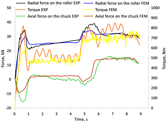 The numerical model of the skew rolling process of bimetallic parts in the Simufact Forming (v.15, MSC Software Company, Hamburg, Germany) software was verified by comparing the course of forces obtained in FEM and experimental tests (Figure 17). Due to the similar values of forces and torque obtained during the experimental tests between the initial outer layer thicknesses (t), the course of forces recorded during the rolling of a billet with an outer layer thickness of t = 7 mm was selected for analysis. The quantitative agreement of the force course was measured with the coefficient of determination R2. The highest quantitative concordance was obtained in the case of the axial force, where the coefficient of determination R2 is 0.92. This shows a very good match between the axial force characteristics obtained from the tests and the axial force obtained from FEM. In the case of the radial force, the R2 coefficient is 0.82. This type of value obtained indicates good agreement of the numerical model. The lowest R2 value was obtained for a torque of 0.77. This is related to the slightly higher torque obtained during the experimental tests. The reason for this is the resulting resistance on the transmission elements, which was not taken into account in the numerical simulation. However, in spite of this, the obtained value of the coefficient of determination for the torque can be considered to indicate satisfactory agreement.