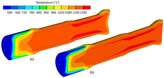 Temperature distribution in the range of (600–1200) °C: (a) thickness of outer layer of billet t = 7 mm; (b) thickness of outer layer of billet t = 9 mm.