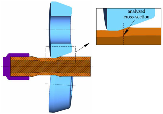 Another extremely important aspect is the condition of stress during rolling, which has an important role in the case of diffusion bonding. Compressive radial and circumferential stresses in the material welding zone facilitate the diffusion bonding of two materials. This means that enough pressure is exerted for diffusion to take place and the materials being joined remain in continuous contact. Radial stresses, circumferential stresses and reduced stresses were analyzed in the forming zone. Figure 21 shows a rolling diagram with a marked cross-section on the first formed stage, which was subjected to stress analysis. For the second stage (with a larger diameter reduction), the cross-sections were made in the same way.