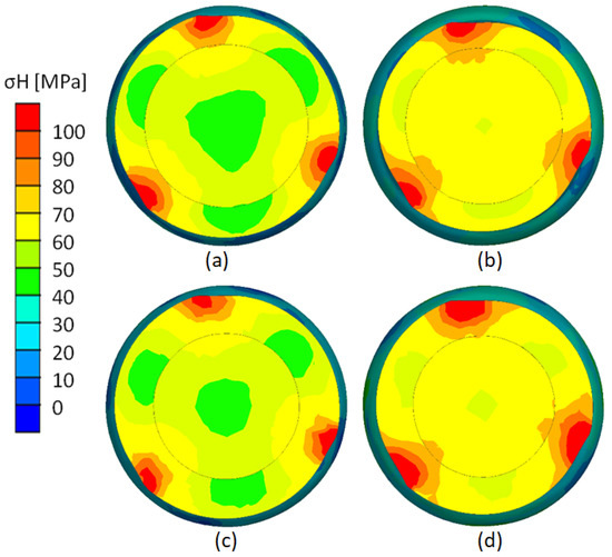 Circumferential stress distribution: (a) variant V (t = 7 mm, δ = 1.14); (b) variant VI (t = 7 mm, δ = 1.27); (c) variant VII (t = 9 mm, δ = 1.14); (d) variant VIII (t = 7 mm, δ = 1.27).