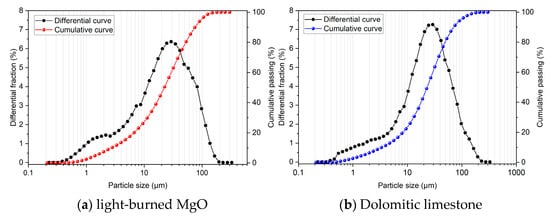 The light-burned MgO (LBM) used for this work was produced by calcining magnesite at 1050 °C and was provided by RHI Magnesita, Contagem, Minas Gerais State, Brazil. The LBM had a specific surface area of 26.71 m2/g (SSA) and a density of 3.45 g/cm3. The analytically pure magnesium sulfate heptahydrate (commercial-grade Epsom salt, MgSO4·7H2O, Labsynth, Diadema, Brazil) used in this study was purchased with a purity of 99,83%. The dolomite limestone (DL), provided by Infibra, located in Leme, São Paulo, Brazil, had a density of 2.79 g/cm3. The chemical compositions and size distributions of the LBM and DL given in Table 1 and Figure 1 were obtained using X-ray fluorescence (XRF, Malvern Panalytical, Malvern, UK, Zetium model) and a laser scattering particle analyzer (Horiba, Kyoto, Japan, LA-950), respectively. LBM and DL’s median particle sizes (D50) were 22.20 µm and 23.10 µm, respectively.