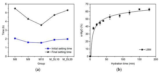 Setting time of MOS cement pastes (a) and hydration kinetics of light-burned MgO (LBM) (b).