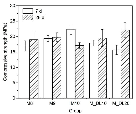 Figure 3 shows the compressive strength of the MOS cement samples at 7 and 28 days of curing, prepared with different molar ratios of MgO/MgSO4 (M8, M9, and M10) and with the replacement of MgO with DL at 10% and 20% by weight in the M10 sample (M_DL10 and M_DL20). After seven days of controlled curing, the compressive strength of the MOS cement pastes is enhanced with increasing molar ratio, by 14% and 32% for the M9 and M10 samples, respectively, compared to M8. However, increasing the replacement of MgO with DL decreased the compressive strength of M10 by 20% and 28%, when the MgO was replaced with 10% and 20% DL, respectively.