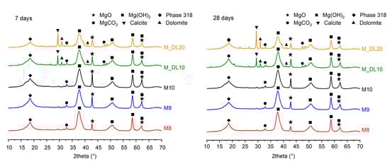 The mechanical performance showed a different behavior at 28 days of curing. For the samples without DL, a higher molar ratio resulted in a less gradual increase in compressive strength, until a loss of strength for the M10 sample was attained, with a 23% decrease at 7 days of curing. This is attributed to the formation of the hydration phases of the MOS cement, which is discussed in the mechanism analysis in Section 3.3. For the pastes with DL replacement, contrary to the mechanical results obtained at seven days of curing, increasing the replacement of MgO by DL improved the compressive strength of the MOS cement at 28 days.