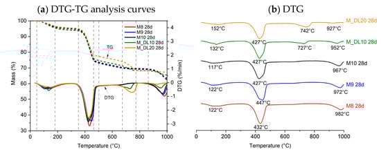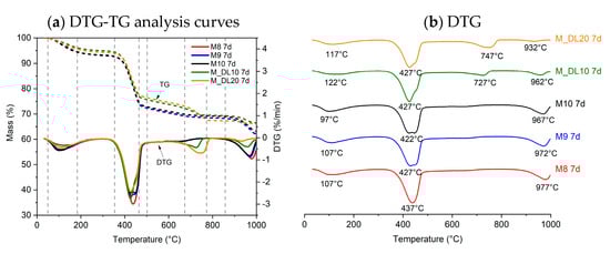 The thermogravimetric analysis (TGA) was conducted on the MOS cement pastes after 7 and 28 days of hydration, as shown in Figure 5 and Figure 6, respectively. From the derivative thermogravimetric (DTG) curve, it is possible to more clearly identify the temperature ranges corresponding to the decomposition of the phases present in MOS cement. The first mass loss, in the range of 50–180 °C, corresponds to the dehydration of the 318 phase due to the loss of adsorbed water. Subsequently, between 350 and 460 °C, the dehydroxylation of uncarbonated brucite or brucite within hydrated magnesium carbonates (HMCs) occurs. The decomposition of carbonates, such as MgCO3 and CaCO3, and HMCs results in endothermic peaks in the range of 650–900 °C and is observed in the mixtures to which dolomitic limestone was added. Above 900 °C, the desulfurization process of MgSO4 in the 318 phase occurs. It can be seen that the samples containing the dolomitic filler showed less desulfurization, which may be associated with the lower amount of MgSO4 present in the hydration phases. The formation of MOS occurs by MgO reacting with H2O and forming brucite on the surface of the MgO particles: MgO + H2O → Mg(OH)2. This brucite, when its concentration on the surface of the particles increases, migrates to the MgSO4 solution: 3Mg(OH)2 + Mg2+ + SO42−+ 8H2O → 3Mg(OH)2-MgSO4-8H2O (318 phase). When DL was added to replace MgO, the formation of brucite and Mg2+ and SO42− decreased, which was reflected in the lower mechanical strength at 7 days of the M_DL10 and M_DL20 samples [27,43].