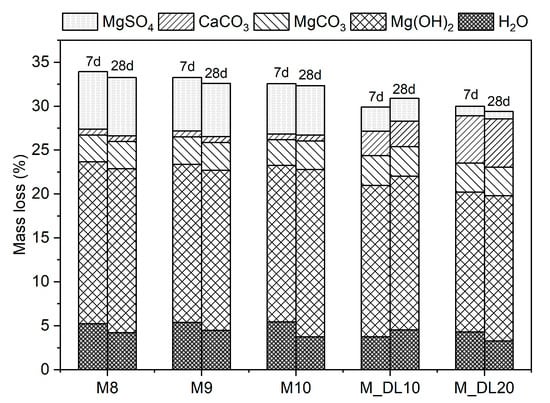 Mass loss of each component of MOS cement pastes at 7 and 28 days of air curing.