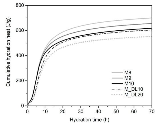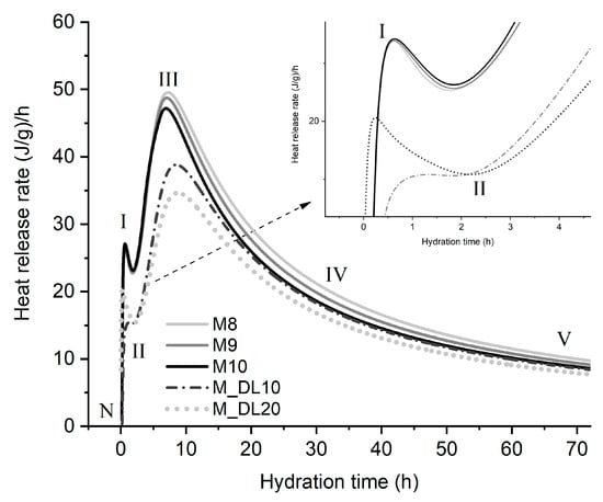 The 72 h hydration heat evolution and accumulative heat of the MOS cement with the different molar ratios of MgO/MgSO4 and levels of replacement of MgO with DL were measured by isothermal calorimetry, and the results are shown in Figure 8 and Figure 9, respectively. According to the heat release rate of hydration of the MOS cement, the hydration process can be divided into five stages: pre-induction (N–I), induction (I–II), acceleration (II–III), deceleration (III–IV), and a stable period (IV–V) [18,38,46]. The pre-induction period occurs at the beginning of the mixing of the active MgO with the aqueous magnesium sulfate solution; it is observed that during this period, M8, M9, and M10 do not have a significant difference in the rate of heat released; however, the inclusion of DL as a substitute for MgO decreased the amount of heat released, which corresponds to a lower amount of OH− generated [18]. The insoluble Mg(OH)2 formed on the surface of the MgO particles prevented the different hydration reactions to some extent, which led to a decrease in the heat of hydration shown in the induction period. Similar to the first period, the rate of heat released was up to 37% lower when the DL was incorporated compared to that of M10. The hydration time until the end of the period was approximately two hours for all of the samples; after this time, the rate of hydration heat release accelerated rapidly, starting with the acceleration period, related to the initial setting time of the pastes, as seen in Figure 2a, and the formation of hydration products composed mainly of the 318 phase and Mg(OH)2 [38]. The isothermal peaks shown in stage III show a gradual reduction in heat release rates when the molar ratio increases and are more evident when the substitution rate of MgO with DL is higher, approximately by 34% and 40% less for the pastes of M_DL10 and M_DL20, respectively, compared to M10. After reaching the highest heat release value, the hydration process enters the deceleration period due to the decrease in the diffusion rate and ion concentration, the hardening of the paste, and the lower surface area of the active MgO, until it reaches a stable period. In summary, as can be seen in Figure 9 and Table 3, increasing the molar ratio and replacing MgO with DL decreased the cumulative heat of hydration of the MOS cement.