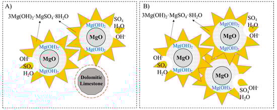 The hydration mechanism of MOS at acceleration period with (A) and without dolomitic limestone (B). Adapted from [38].