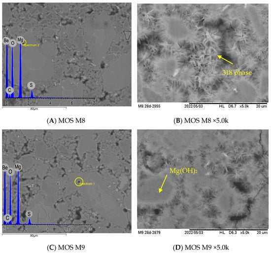 The phases with a greater stability depend on the composition of the paste mixture; the molar concentrations of MgO, MgSO4, and H2O are the main parameters that influence the formation of hydration products [20,21]. Tang et al. [20] evaluated the influence of the MgSO4/H2O ratio in the pore structure evolution of MOS cement pastes and followed the formation of hydration products by taking non-contact impedance measurements (NCIMs). The results demonstrate that the decrease in the ratio led to a decrease in the kinetics of the formation of hydration products, which were identified by the mass loss in the range between 80 and 250 °C, which is associated with the dehydration of the phases responsible for the strength of the MOS binder. On the other hand, increasing the MgO/MgSO4 ratio promoted more significant mass loss and was related to an enhancement in the formation of hydration products (the 517 and 318 phases) [20]. The same authors evaluated the influence of the MgSO4/H2O ratio on the formation of phases that contribute to the increase in compressive strength of MOS cement samples and the interference in the formation of porosity during the hardening of the samples [21]. The increase in the amount of water during the synthesis of MOS cement promoted a decrease in compressive strength at all curing ages. The MgSO4/H2O ratio variation caused changes in the pore structure (porosity, incremental pore volume, pore tortuosity, average pore diameter, and maximal pore diameter) of MOS cement pastes.