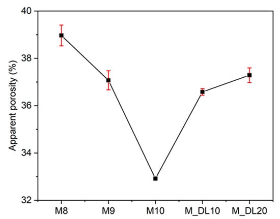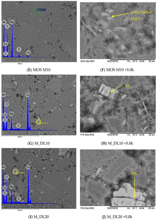 Figure 11 shows the SEM images of the MOS cement samples at 28 d of curing. The XRD and EDS results indicate that the plate-like crystals are the Mg(OH)2 phase, while the 318 phase starts to form and grow at the solid–liquid interface of the Mg(OH)2 crystals, as described in Section 3.5. According to Huihui Du et al. (2022) [38], the needle-cluster phase in MOS cement is considered to be the 318 phase, which is responsible for the increase in strength at longer curing times, while the Mg(OH)2 contributes to the initial strength gain [38,40]. It is also observed in Figure 11F that a large amount of unhydrated MgO particles could explain the lower heat of hydration generated in M10 compared to M8 and M9; some hydrated products gradually cover these particles that are present in all samples. The higher compressive strength results in the M_DL10 and M_DL20 matrix (Figure 3) may be due to the needle-cluster crystals of the 318 phase that seem to have a higher growth at the solid–liquid interface at 28 d, compared to the M10 matrix, which shows the greater formation of the Mg(OH)2 plates and lower levels of porosity, as observed in Figure 11E and Figure 12. On the other hand, the DL particles showed no formation of crystallization phases on their surface, and it can be observed in the microstructures shown in Figure 11E,G,I that the porosity increases with the increase in the replacement rate of MgO with DL, which was also confirmed by the apparent porosity tests after seven days of curing (Figure 12). These observations may explain the formation of the new MgCO3 peaks in the M_DL10 and M_DL20 pastes, due to a better diffusion of CO2 in the MOS cement structure promoted by the higher level of porosity [47]. These observations are consistent with the mechanical results, as well as the XRD and isothermal calorimetry analyses.